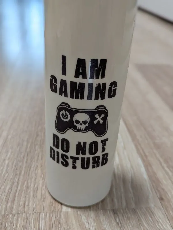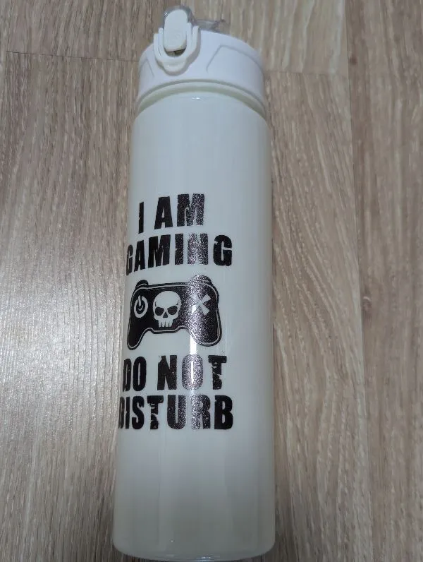 (Ši stilinga balta gertuvė su griežtu užrašu „I Am Gaming, Do Not Disturb“ ir kaukolės simboliu pultelyje yra idealus kompanionas ilgiems žaidimų vakarams. Patogus, sandarus dangtelis leidžia atsigaivinti akimirksniu, neatitraukiant akių nuo ekrano, o minimalistinis dizainas puikiai dera prie bet kurios kompiuterio stotelės. Tai ne tik praktiškas aksesuaras, padedantis palaikyti hidrataciją, bet ir aiški žinutė, kad žaidimo metu jūsų dėmesys priklauso tik pergalei)