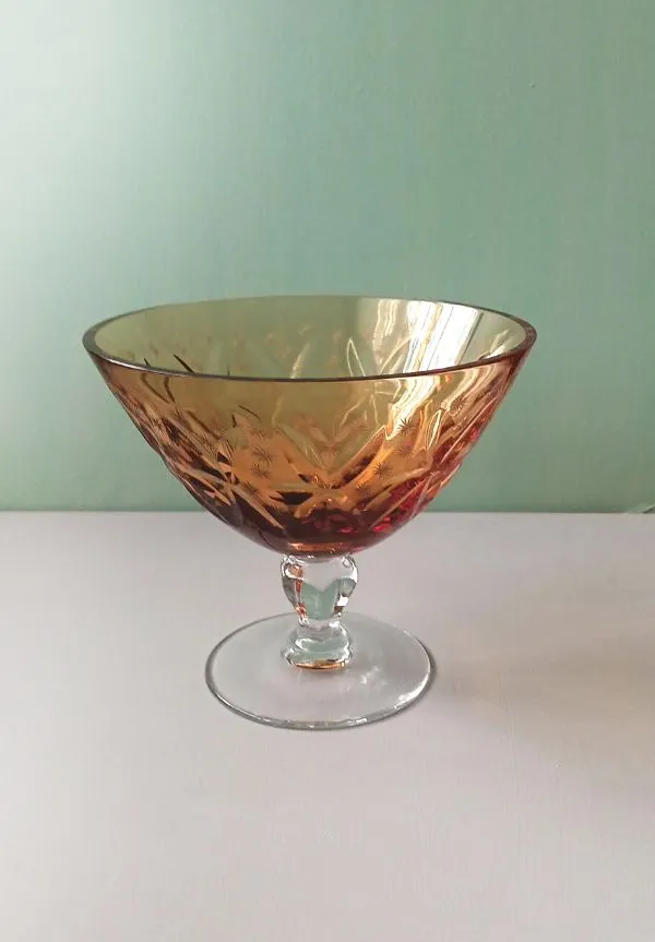 Vintažinė „Gusev Crystal Factory“ (GKhZ) gintarinės (medaus) spalvos stiklo vaza ant kojelės iš rinkinio „Auksinės vestuvės“, pagaminta apie 1972 metus, dailininkas E. Rogovas. Ši serija 1973 m. buvo apdovanota aukso medaliu.