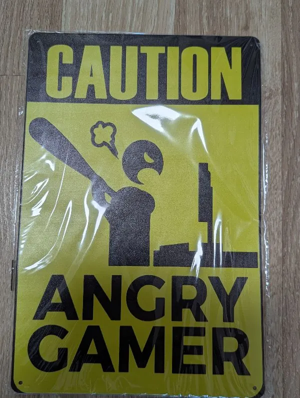(Ši ryški, geltonos ir juodos spalvų metalinė lentelė su užrašu „Caution: Angry Gamer“ yra puikus humoro elementas bet kurio žaidėjo kambariui. Originalus dizainas su įspėjamąja piktograma suteikia erdvei charakterio ir aiškiai (bei linksmai) įspėja aplinkinius apie vykstančias įtemptas virtualias kovas. Tai stilinga ir ilgaamžė dovana, kurią dėl paruoštų skylučių kampuose itin lengva pritvirtinti prie durų ar sienos.)