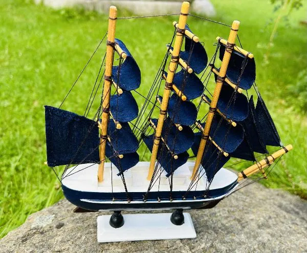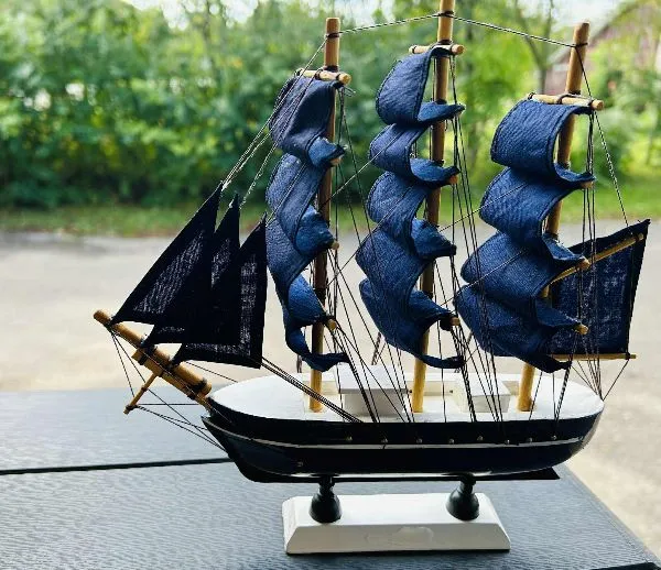 Laivas mėlynomis burėmis puikiai tinka kaip interjero detalė, stalo dekoro elementas.