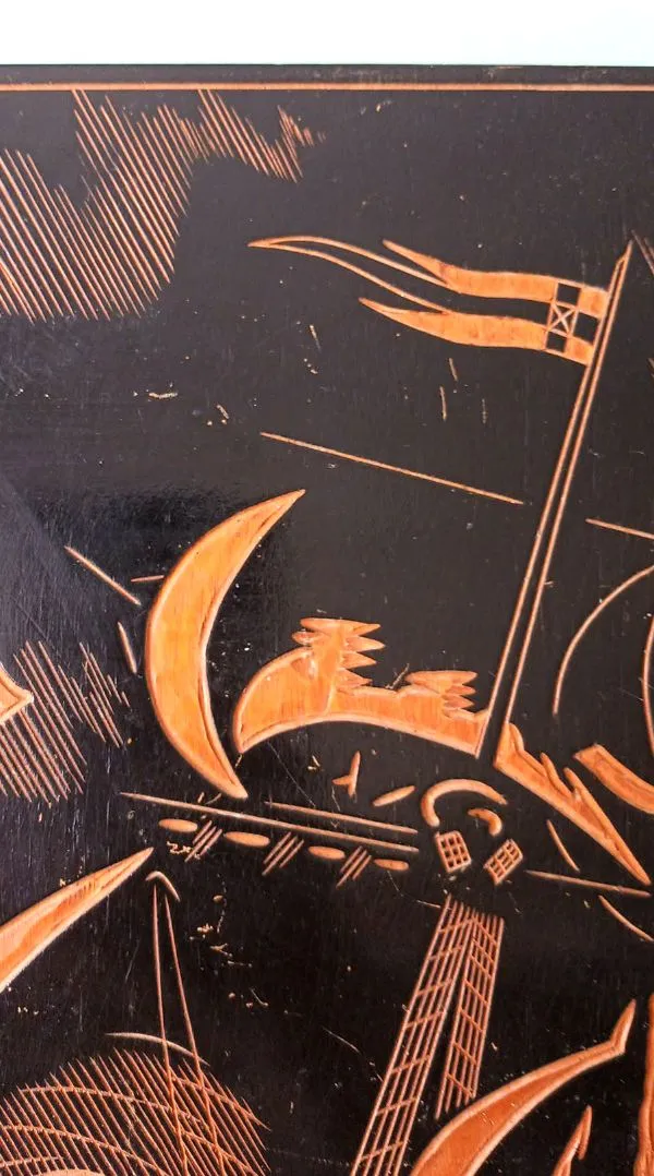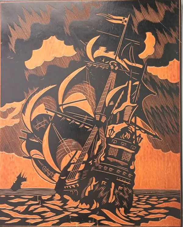 Tarybinių laikų medžio raižinys (ksilografija) ant dažytos faneros. Motyvas: burlaivis audringoje jūroje. Dydis 40,5 x 50,5 cm. Laikotarpis XX a. 7–8 dešimtmetis (vintage). Nugarėlėje išlikę kontrolės antspaudai.
