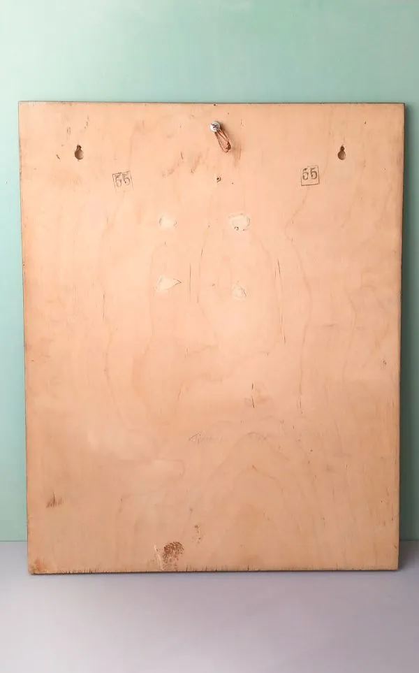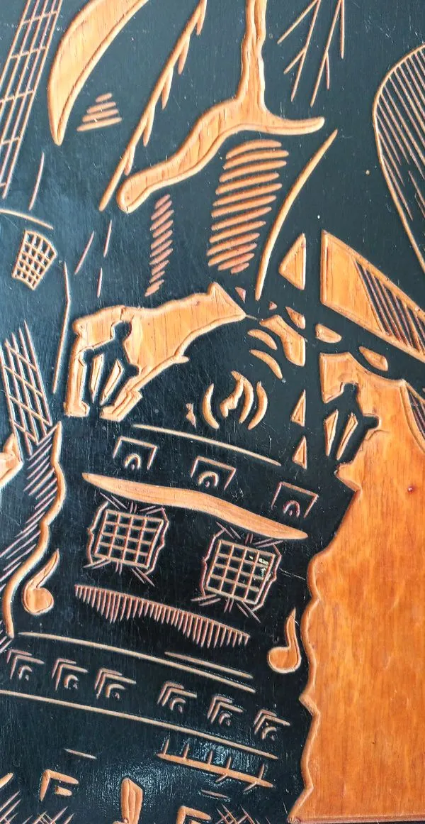 Tarybinių laikų medžio raižinys (ksilografija) ant dažytos faneros. Motyvas: burlaivis audringoje jūroje. Dydis 40,5 x 50,5 cm. Laikotarpis XX a. 7–8 dešimtmetis (vintage). Nugarėlėje išlikę kontrolės...