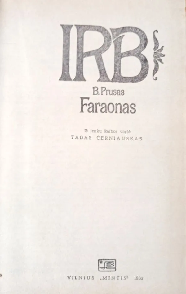 Lenkų literatūros klasikas B. Prusas (1847-1912) romane, remdamasis gausia egiptologine medžiaga, įtaigiai piešia senovės Egipto (XI a. pr. Kr.) žmonių gyvenimo būdą, jų tarpusavio santykius, tūksta...