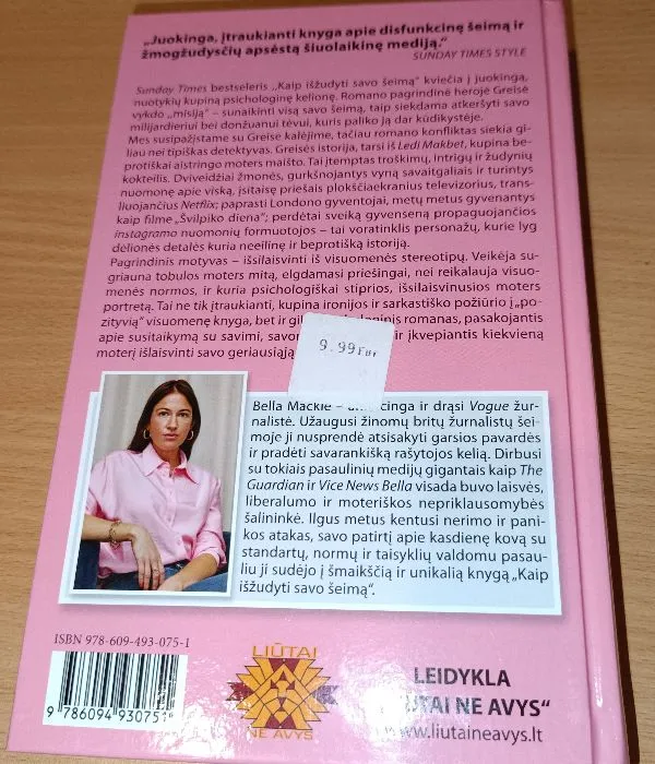 Sunday Times bestseleris „Kaip išžudyti savo šeimą“ kviečia į juokingą, nuotykių kupiną psichologinę kelionę. Romano pagrindinė herojė Greisė vykdo „misiją“ – sunaikinti visą savo šeimą, taip siekdama atkeršyti savo milijardieriui bei donžuanui tėvui, kuris paliko ją dar kūdikystėje. Mes susipažįstame su Greise kalėjime, tačiau romano konfliktas siekia giliau nei tipiškas detektyvas. Greisės istorija, tarsi iš ledi Makbet, kupina beprotiškai aistringo moters maišto. Tai įtemptas troškimų, intrigų ir žudynių kokteilis. Dviveidžiai žmonės, gurkšnojantys vyną savaitgaliais ir turintys nuomonę apie viską, įsitaisę priešais plokščiaekranius televizorius, transliuojančius Netflix; paprasti Londono gyventojai, metų metus gyvenantys kaip filme „Švilpiko diena“; perdėtai sveiką gyvenseną propaguojančios instagramo influencerės – tai voratinklis personažų, kurie lyg dėlionės detalės kuria neeilinę ir beprotišką istoriją. Pagrindinis motyvas – išsilaisvinti iš visuomenės stereotipų. Veikėja sugriauna tobulos moters mitą, elgdamasi priešingai, nei reikalauja visuomenės normos, ir kuria psichologiškai stiprios, išsilaisvinusios moters portretą. Tai ne tik įtraukianti, kupina ironijos ir sarkastiško požiūrio į „pozityvią“ visuomenę knyga, bet ir gilus psichologinis romanas, pasakojantis apie susitaikymą su savimi, savomis traumomis ir įkvepiantis kiekvieną moterį išlaisvinti savo geriausiąją versiją. Bella Mackie – ambicinga ir drąsi Vogue žurnalistė. Užaugusi žinomų britų žurnalistų šeimoje ji nusprendė atsisakyti garsios pavardės ir pradėti savarankišką rašytojos kelią. Dirbusi su tokiais pasaulinių medijų gigantais kaip The Guardian ir Vice News Bella visada buvo laisvės, liberalumo ir moteriškos nepriklausomybės šalininkė. Ilgus metus kentusi nerimo ir panikos atakas, savo patirtį apie kasdienę kovą su standartų, normų ir taisyklių valdomu pasauliu ji sudėjo į šmaikščią ir unikalią knygą „Kaip išžudyti savo šeimą“. *** „Neįmanoma atsitraukti! Nuo Greisės emocijų jums kūnu bėgios šiurpuliukai. Penkios žvaigždutės!“ – Cosmopolitan „Juokinga, įtraukianti knyga apie disfunkcinę šeimą ir žmogžudysčių apsėstą šiuolaikinę mediją.“ – Sunday Times Style „Kurioziška ir kupina juodojo humoro.“ – Elle