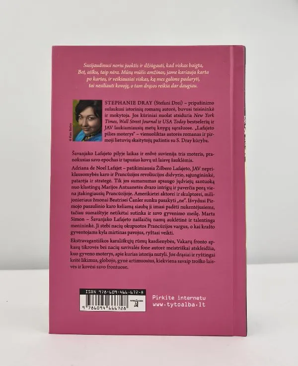 Kartu kovojome per karą. Žinome apie vienas kitą dalykų, nežinomų niekam daugiau, kurių nesupras joks kitas vyras ar moteris. Šis ryšys neįveikiamas. Stephanie Dray (Stefani Drei) – pripažinimo sulaukusi istorinių romanų autorė, buvusi teisininkė ir mokytoja. Jos kūriniai nuolat atsiduria New York Times, Wall Street Journal ir USA Today bestselerių ir JAV laukiamiausių metų knygų sąrašuose. „Lafajeto pilies moterys" – vienuoliktas autorės romanas ir pirmoji lietuvių skaitytojų pažintis su S. Dray kūryba. Šavanjako Lafajeto pilyje laikas ir erdvė suvienija tris moteris, pranokusias savo epochas ir tapusias kovų už laisvę šauklėmis. Adriana de Noel Lafajet – patikimiausia Žilbero Lafajeto, JAV nepriklausomybės karo ir Prancūzijos revoliucijos didvyrio, sąjungininkė, patarėja ir strategė. Tik jos sumanumas apsaugo jųdviejų santuoką nuo klastingų Marijos Antuanetės dvaro intrigų ir paverčia porą viena įtakingiausių Prancūzijoje. Amerikietei aktorei ir skulptorei, milijonieriaus žmonai Beatrisei Čanler sunku pasakyti „ne". Išvydusi Pirmojo pasaulinio karo keliamą siaubą ji apsiima padėti nukentėjusiems, tačiau sumaištyje netikėtai sutinka ir savo gyvenimo meilę. Marta Simon – Šavanjako Lafajeto našlaičių namų auklėtinė ir talentinga menininkė. Ji stebi nacių okupuotos Prancūzijos vargus, o kai krašto gyventojams kyla mirtinas pavojus, ryžtasi veikti. Ekstravagantiškos karališkųjų rūmų kasdienybės, Vakarų fronto apkasų tikrovės bei nacių savivalės fone autorė meistriškai atskleidžia, kuo gyveno moterys, apie kurias istorija nutyli. Jos drąsiai ir ryžtingai keitė likimus, globojo, gynė artimuosius, kiekviena savaip troško laisvės ir kovėsi savo frontuose.
