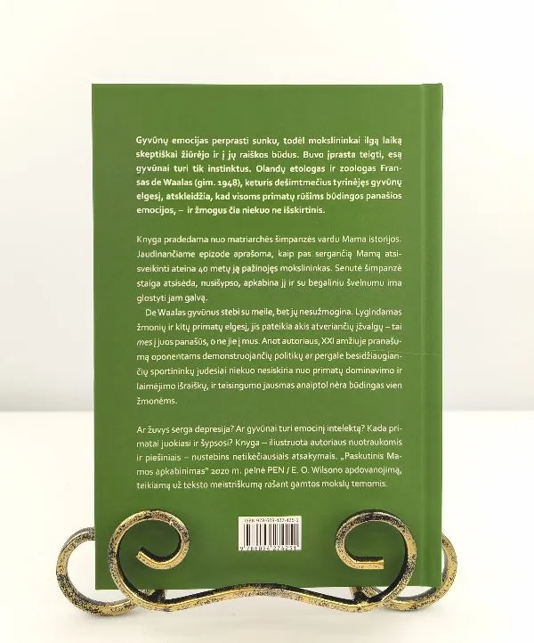 „Kilniaširdiška ir kupina atjautos knyga. Joje rasite daugybę įžvalgų apie gyvūnų – taip pat ir savo – elgesį.“ Yuval Noah Harari, knygos „Sapiens“ autoriusGyvūnų emocijas perprasti sunku, todėl mokslininkai ilgą laiką ir į jų išraiškas žiūrėjo skeptiškai. Buvo įprasta teigti, esą gyvūnai turi tik instinktus. Olandų etologas ir zoologas Fransas de Waalas (gim. 1948), keturis dešimtmečius tyrinėjęs gyvūnų elgesį, atskleidžia, kad visoms primatų rūšims būdingos panašios emocijos, – ir žmogus čia niekuo ne išskirtinis.Knyga pradedama nuo matriarchės šimpanzės vardu Mama istorijos. Jaudinančiame epizode aprašoma, kaip pas sergančią Mamą atsisveikinti ateina 40 metų ją pažinojęs mokslininkas. Senutė šimpanzė staiga atsisėda, nusišypso, jį apkabina ir su begaliniu švelnumu ima glostyti jam galvą.De Waalas gyvūnus stebi su meile, bet jų nesužmogina. Lygindamas žmonių ir kitų primatų elgesį, pateikia akis atveriančių įžvalgų – tai mes į juos panašūs, o ne jie į mus. Ar žuvys serga depresija? Ar gyvūnai turi emocinį intelektą? Kada primatai juokiasi ir šypsosi? Knyga – beje, iliustruota autoriaus nuotraukomis ir piešiniais – pateiks netikėčiausių atsakymų. Už gebėjimą puikiu stiliumi perteikti mokslo faktus autorius 2020 m. gavo prestižinį PEN / E. O. Wilsono apdovanojimą.