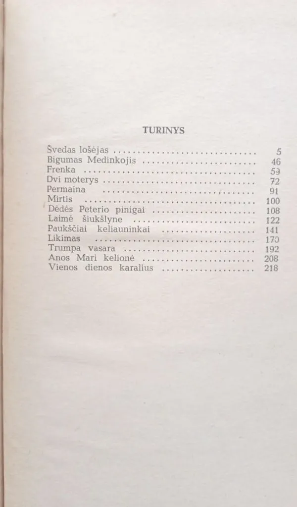 Šioje knygoje sudėta ankstyvoji autoriaus kuryba: -Švedas lošėjas, Bigumas Medinkojis, Frenka, Dvi moterys, Permaina, Mirtis, Dėdės Peterio pinigai, Laimė šiukšlyne, Paukščiai keliauninkai, Likimas, Trumpa vasara, Anos Mari kelionė, Vienos dienos karalius.